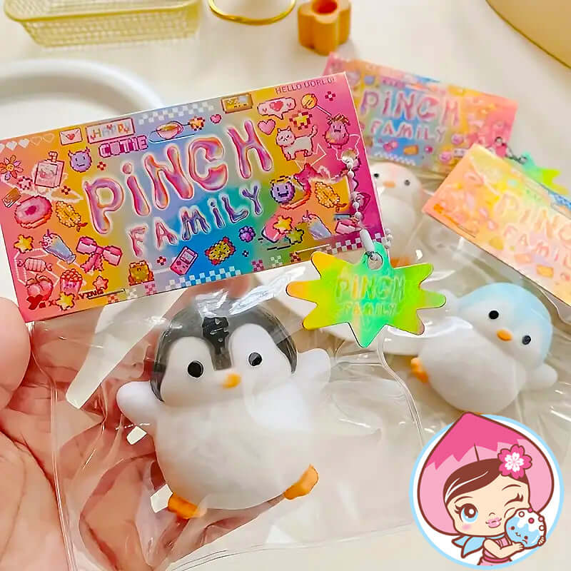kawaii stress relief squishy toys from Pinch Family, displayed with colorful packaging for stress relief fun.