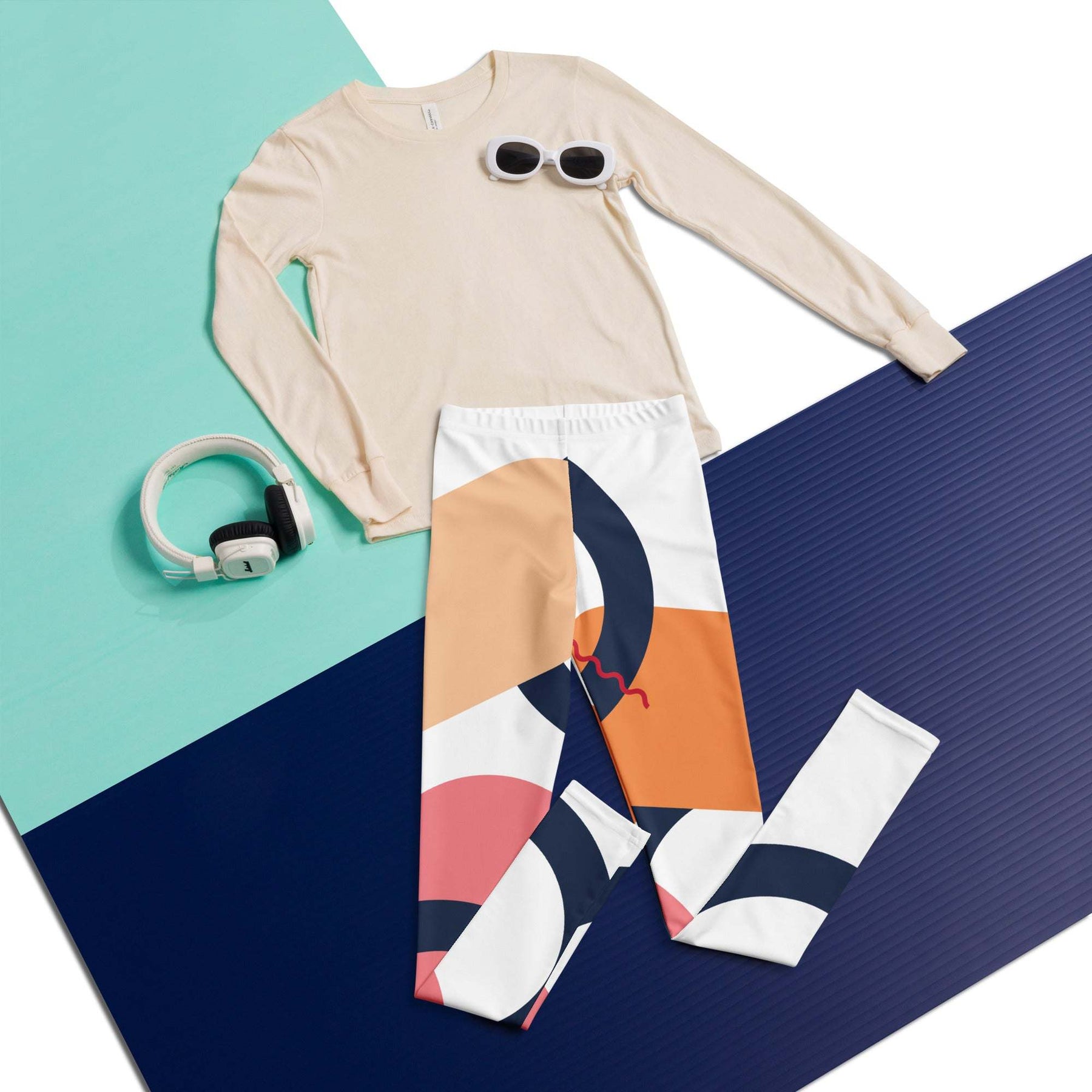 Youth leggings with vibrant abstract geometric pattern in peach, orange, pink, and navy blue on white background, made of soft stretchy microfiber fabric for comfort and durability