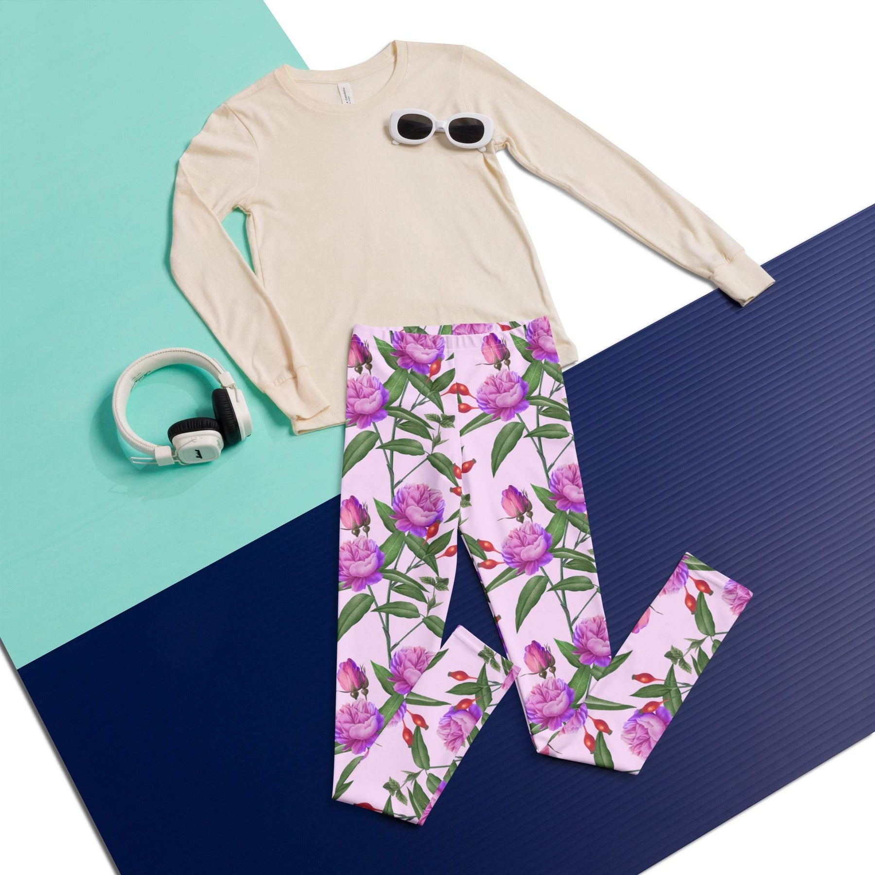 Youth leggings with vibrant pink floral pattern, soft and stretchy fabric for comfort and a perfect fit