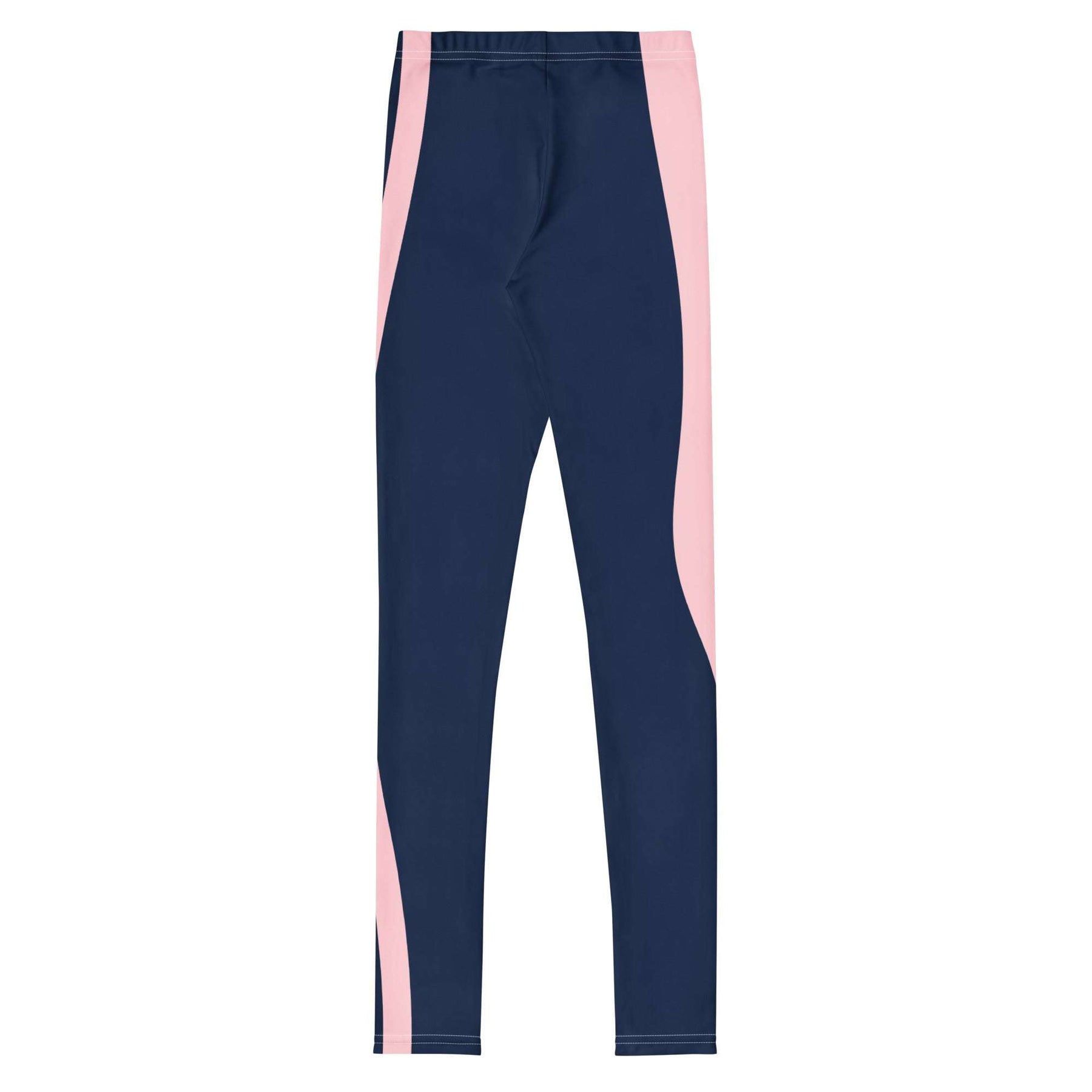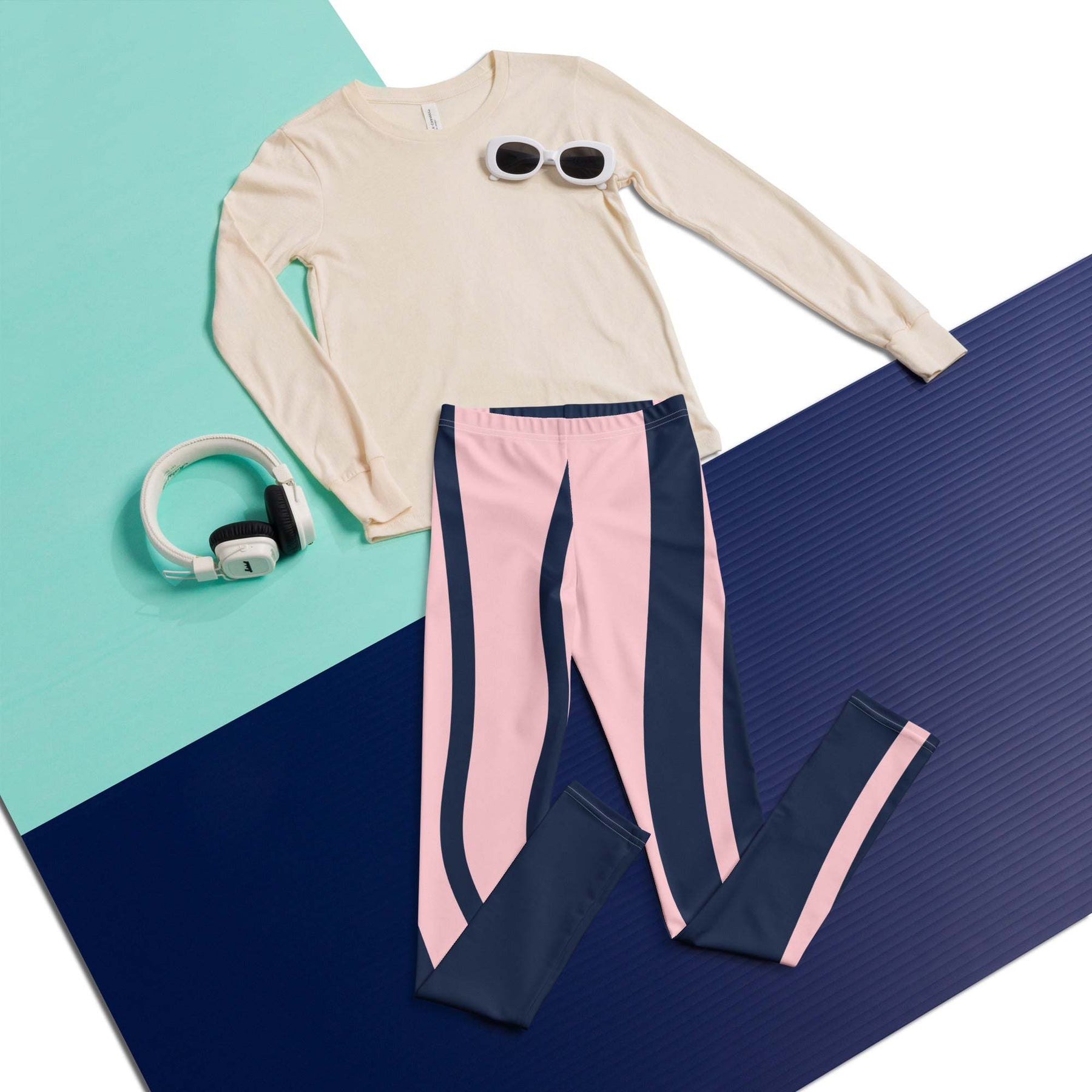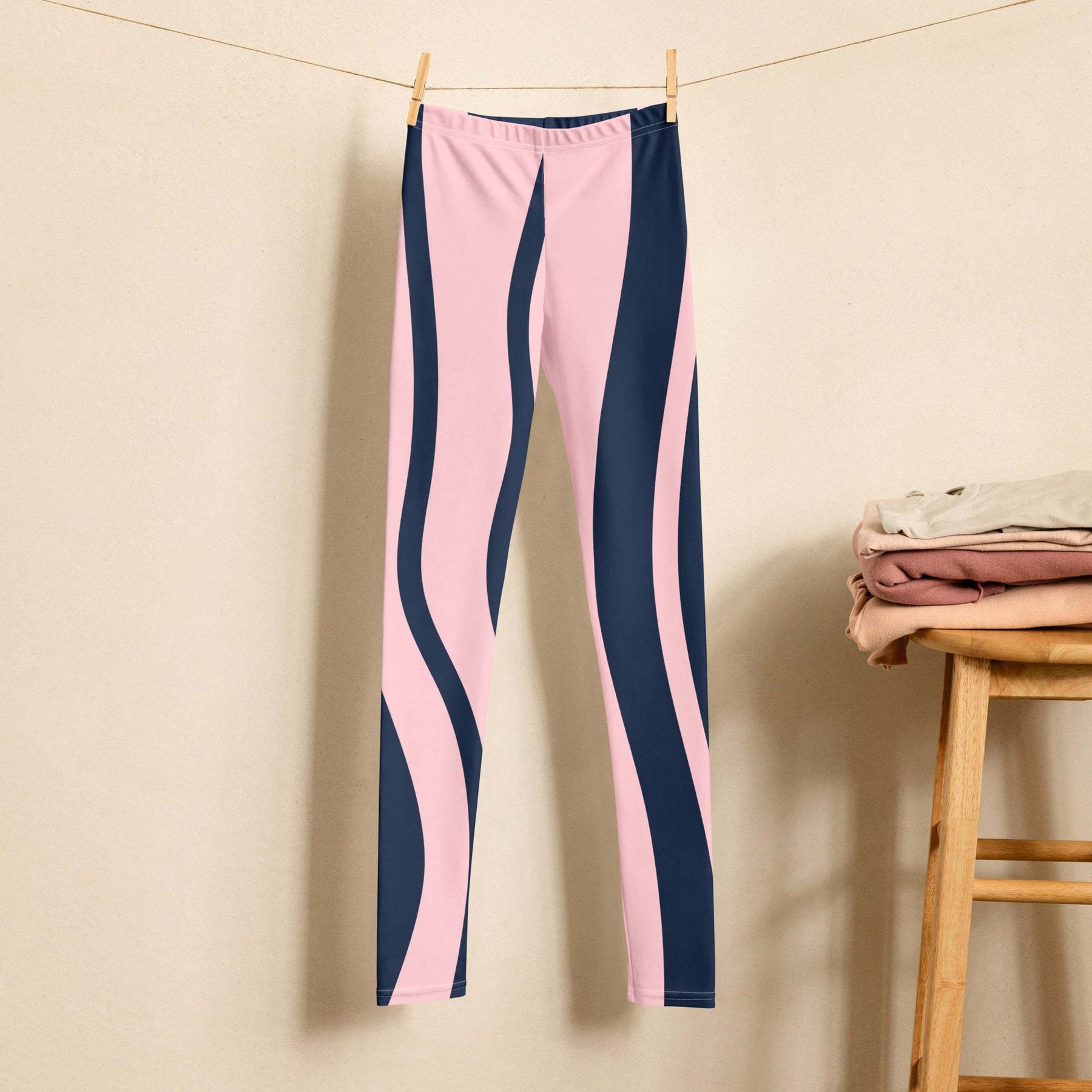 Youth leggings with vibrant pink and navy wavy stripes, made from soft and stretchy microfiber fabric for a comfortable fit.