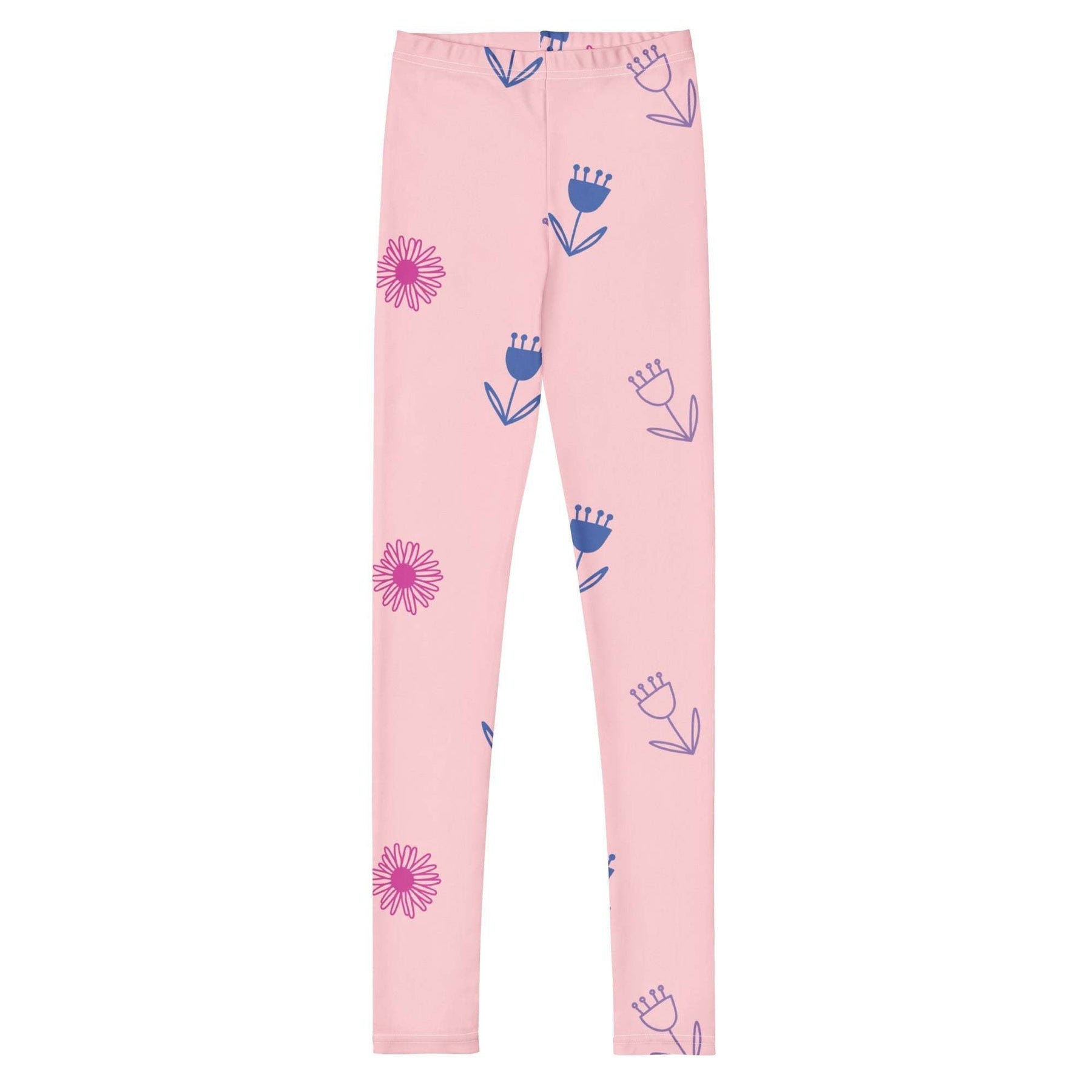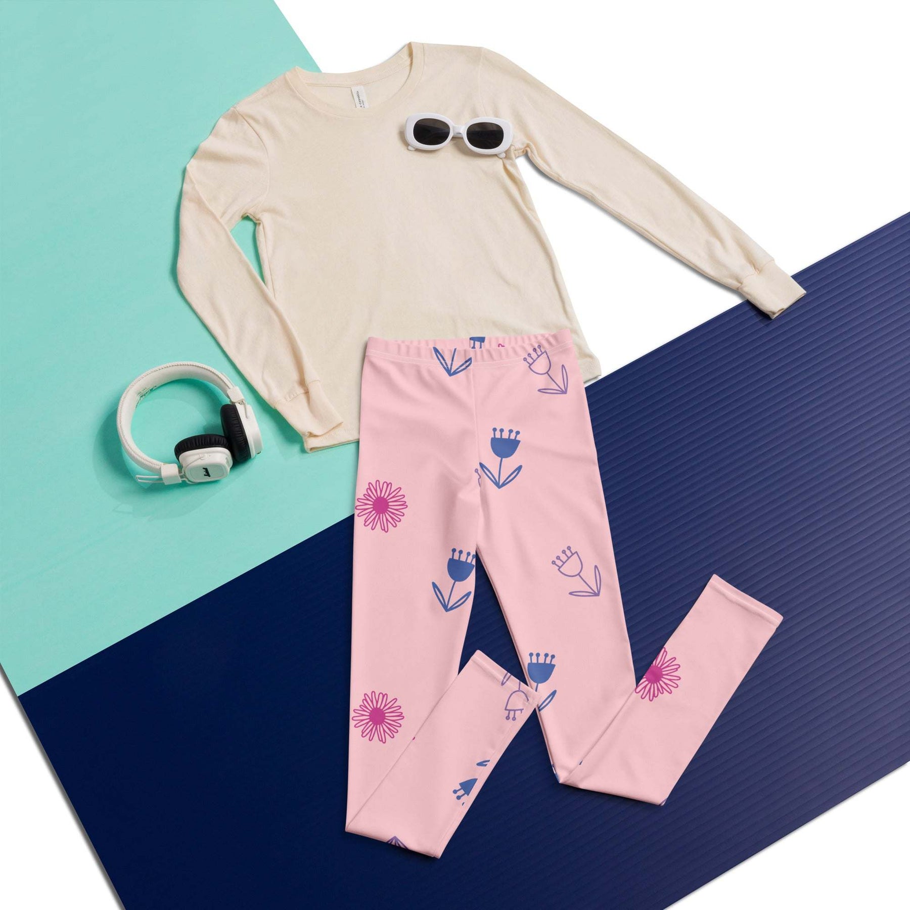 Pink youth leggings with blue and purple floral patterns, soft and stretchy for comfortable fit