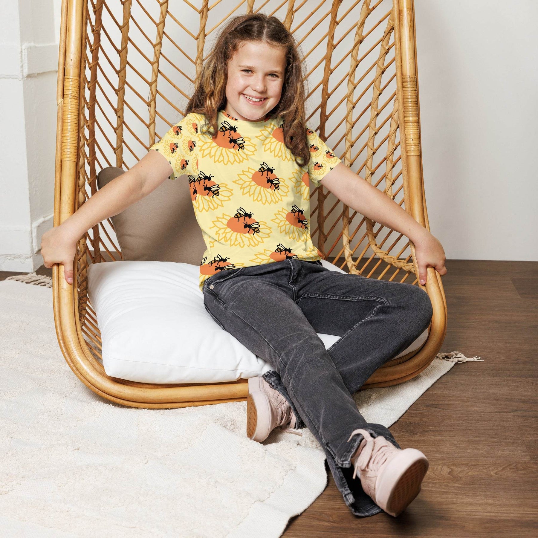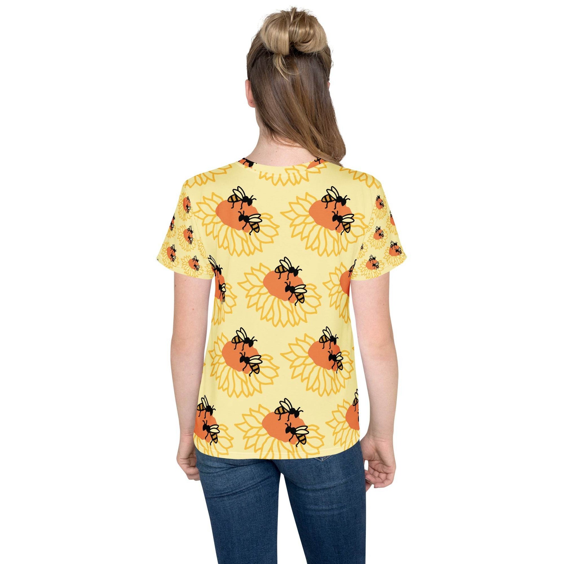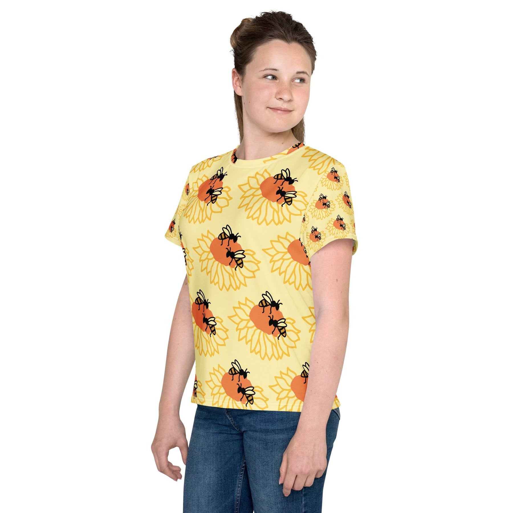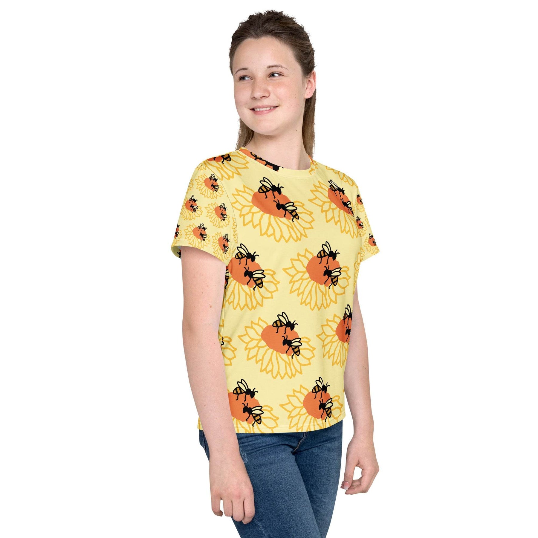 Youth crew neck t-shirt with colorful bee and sunflower design on soft, stretchy fabric worn by teen girl
