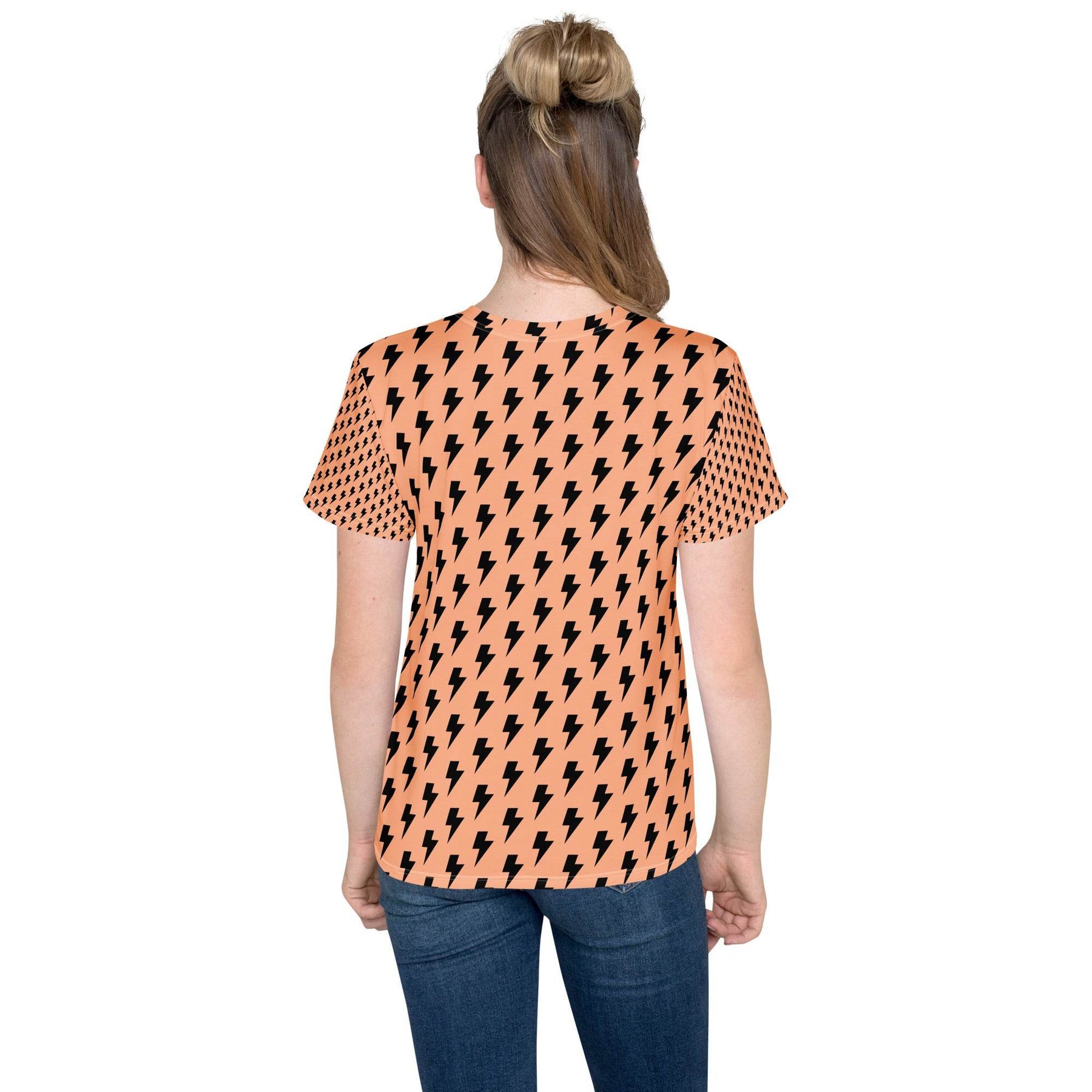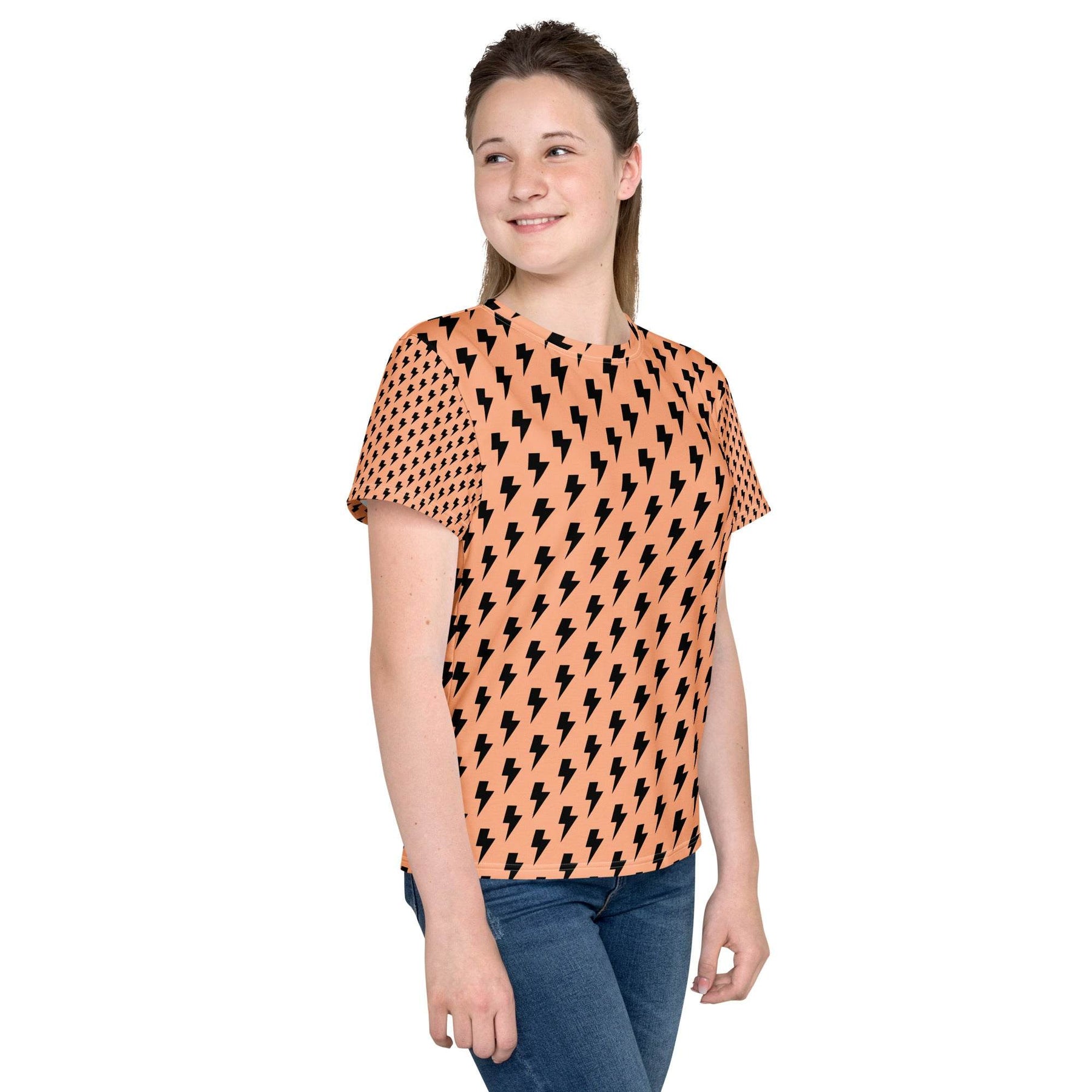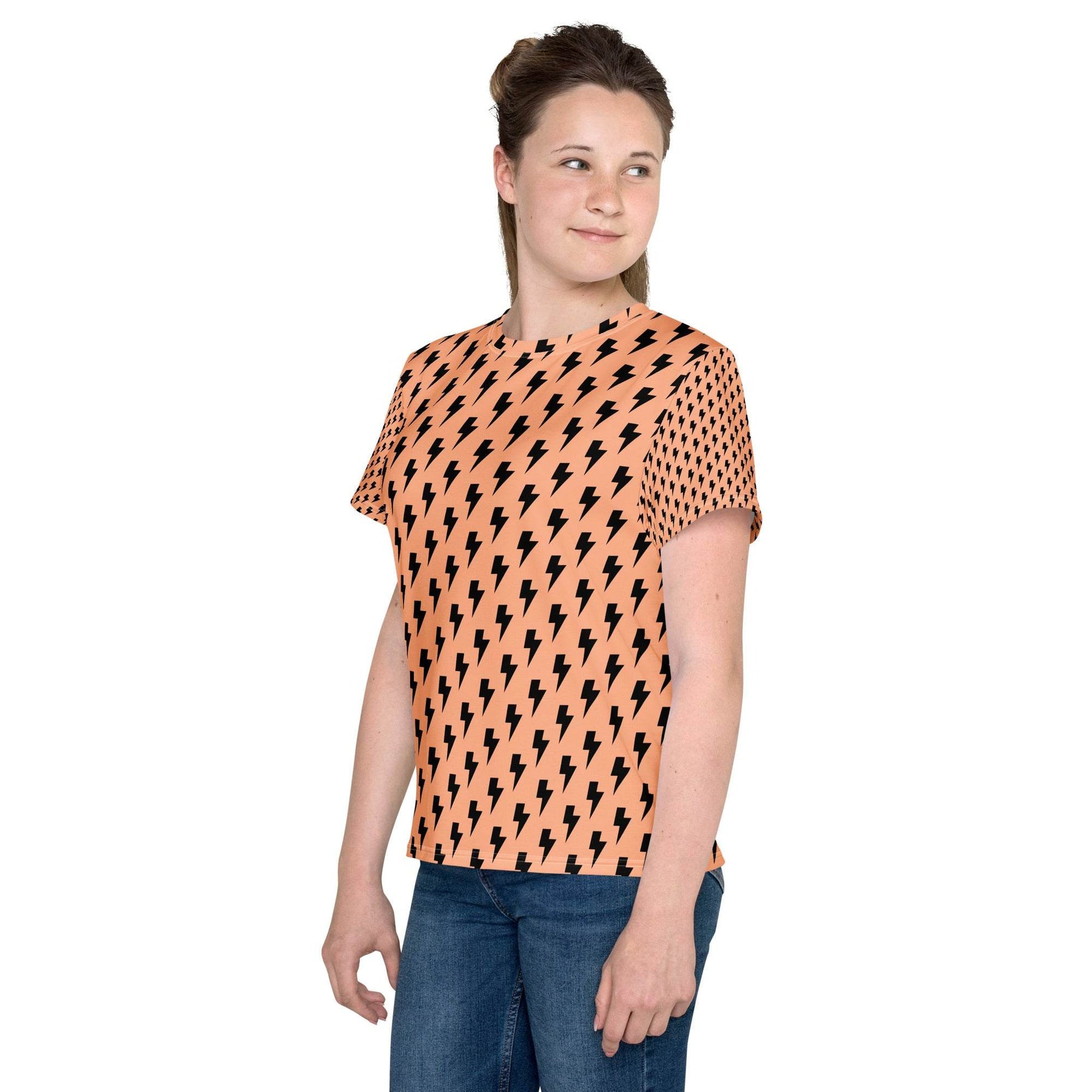 Teen wearing orange youth crew neck t-shirt with black lightning and triangle pattern paired with blue jeans