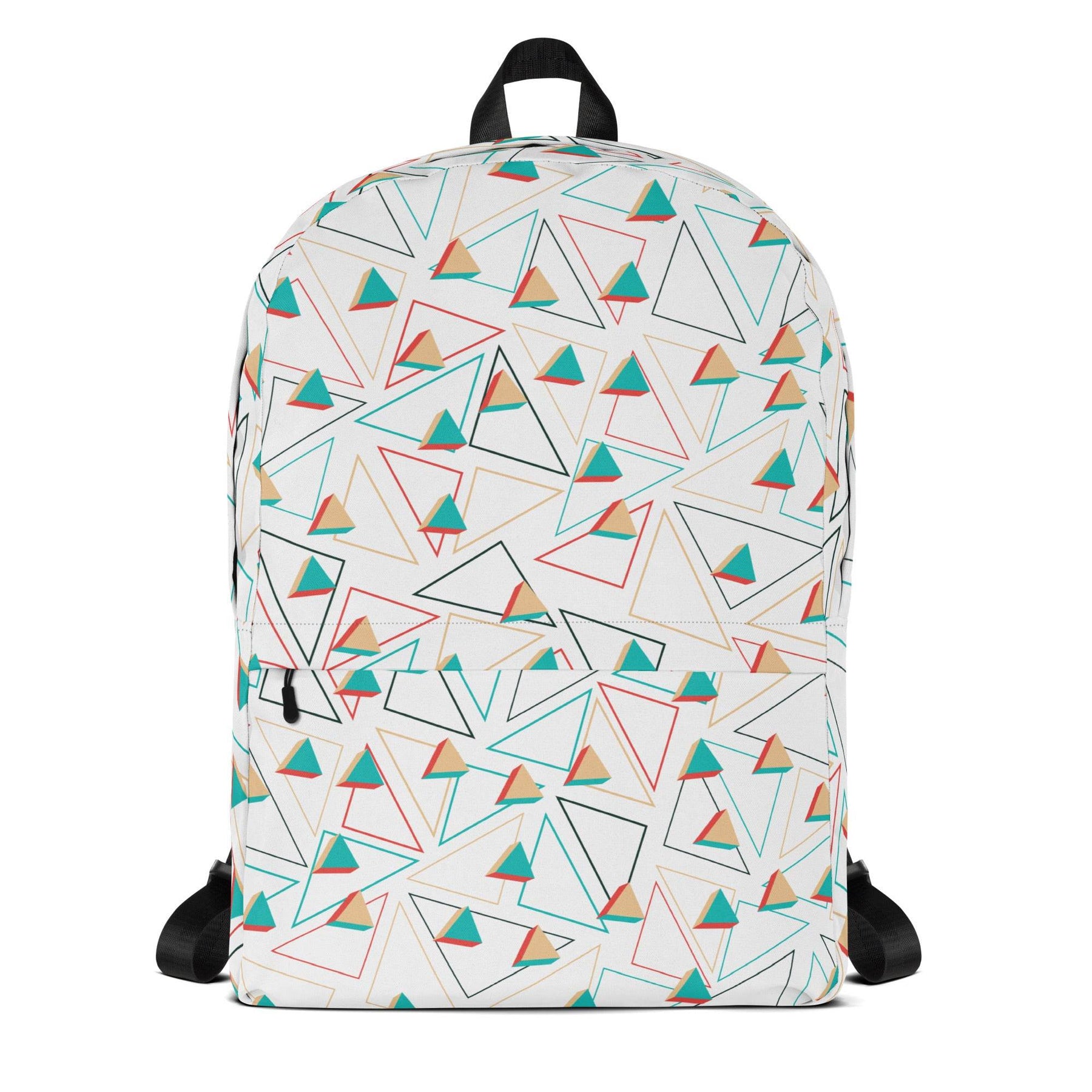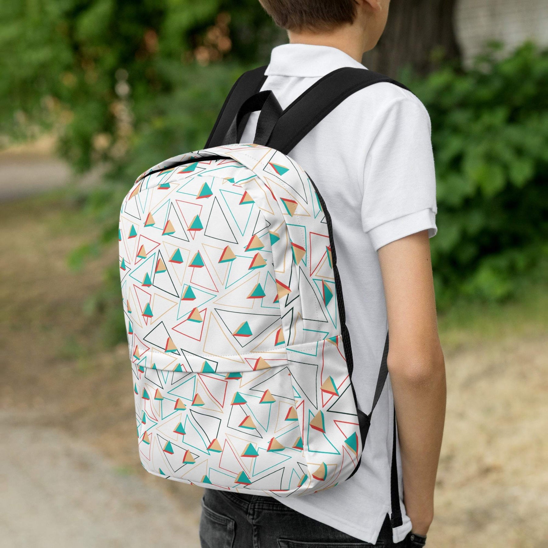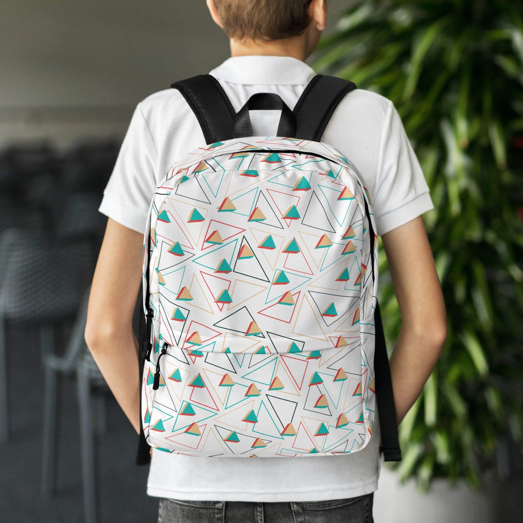 medium size backpack with colorful geometric pattern worn by person indoors