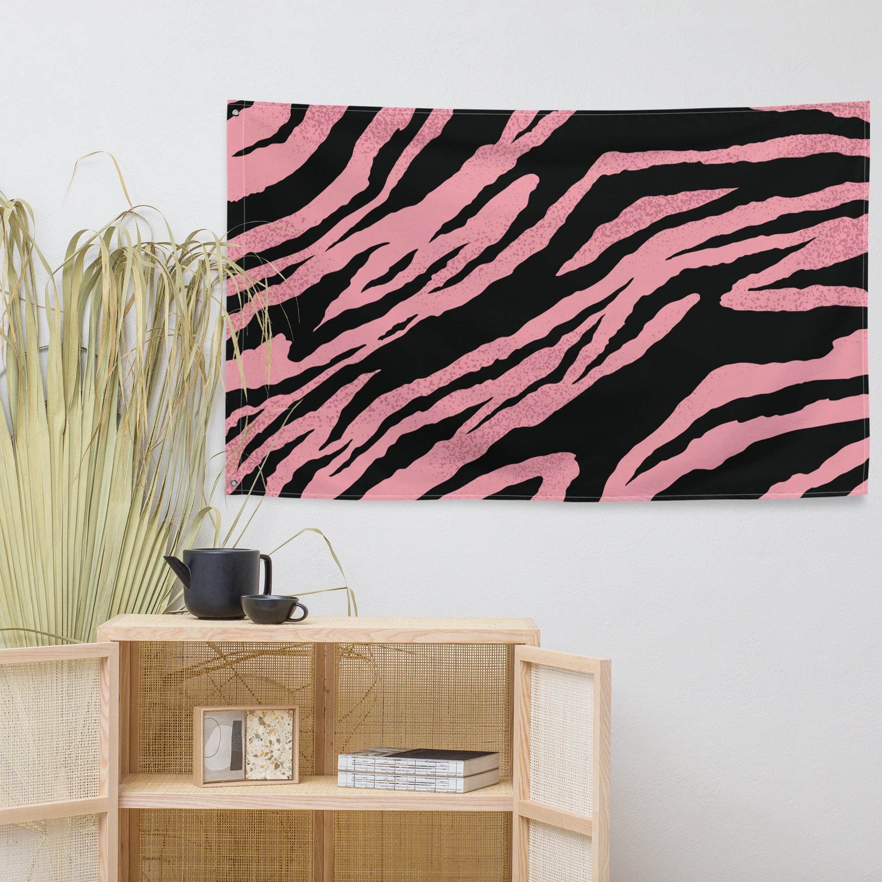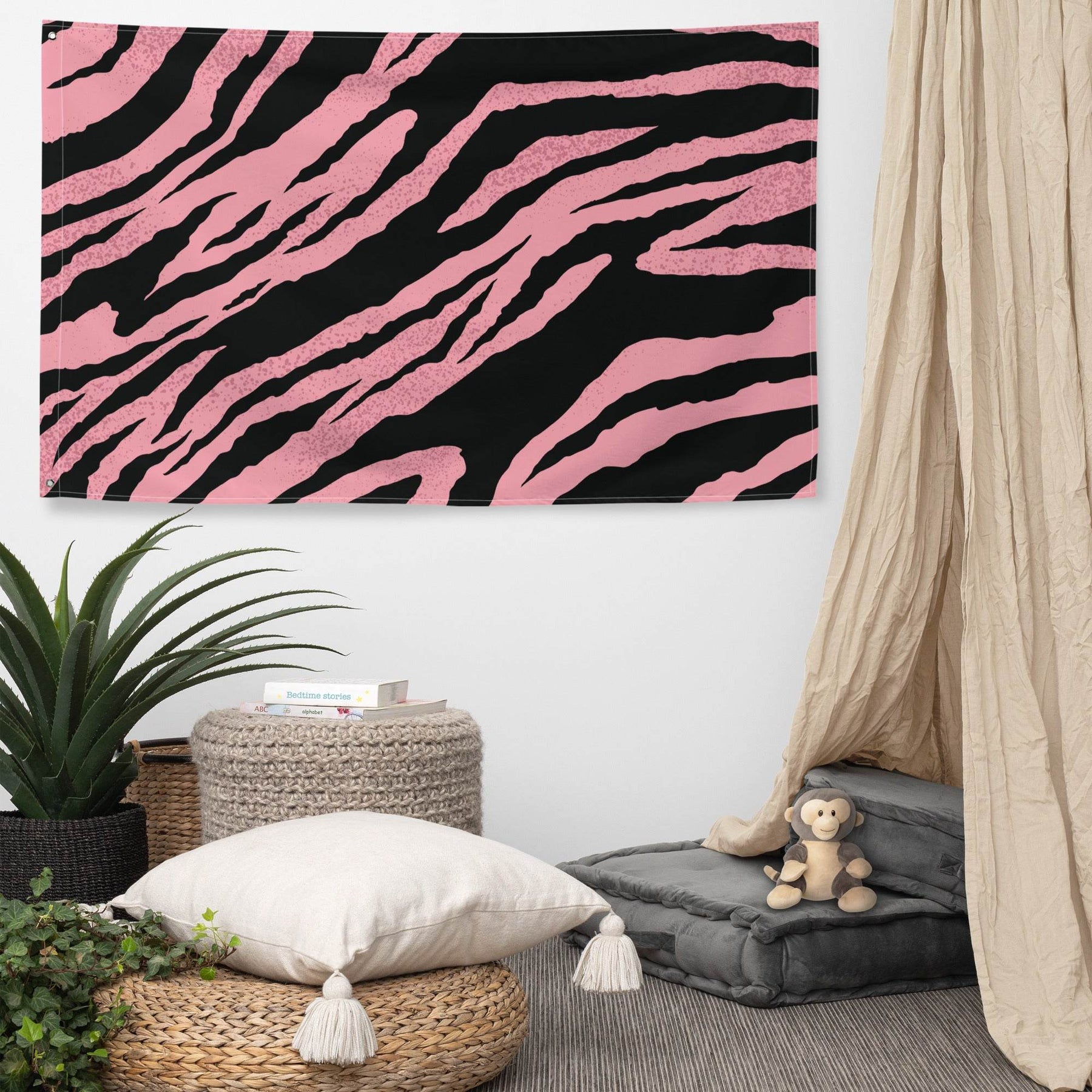 Unique pink and black zebra print flag made of durable polyester hanging above a bed in a modern bedroom setting