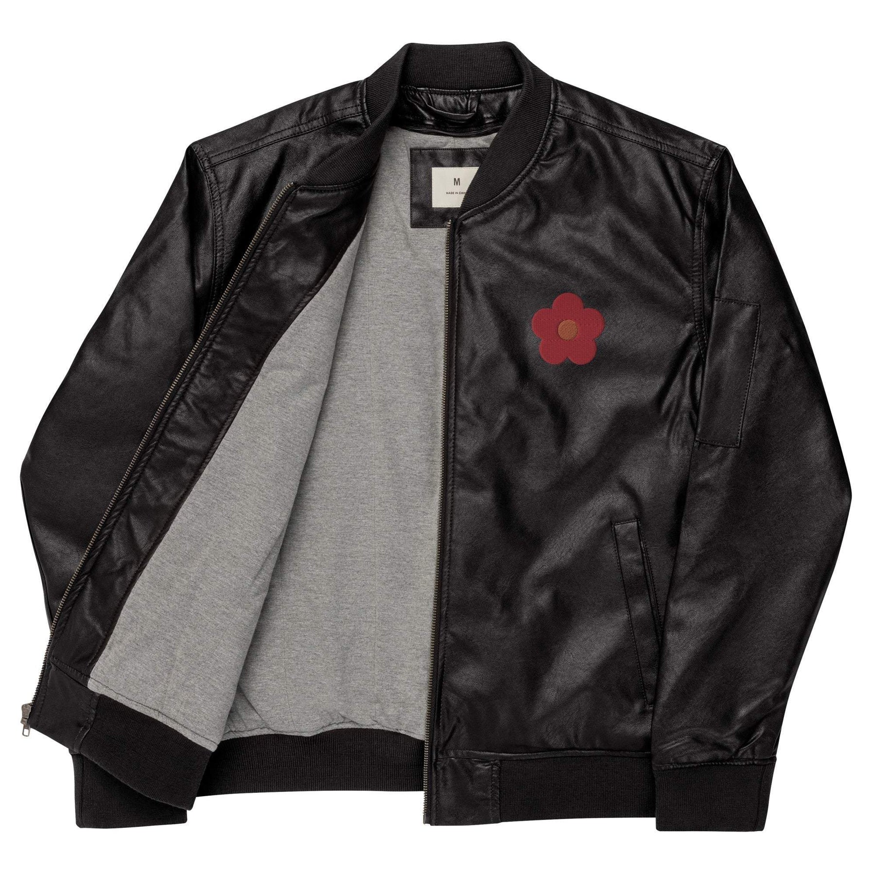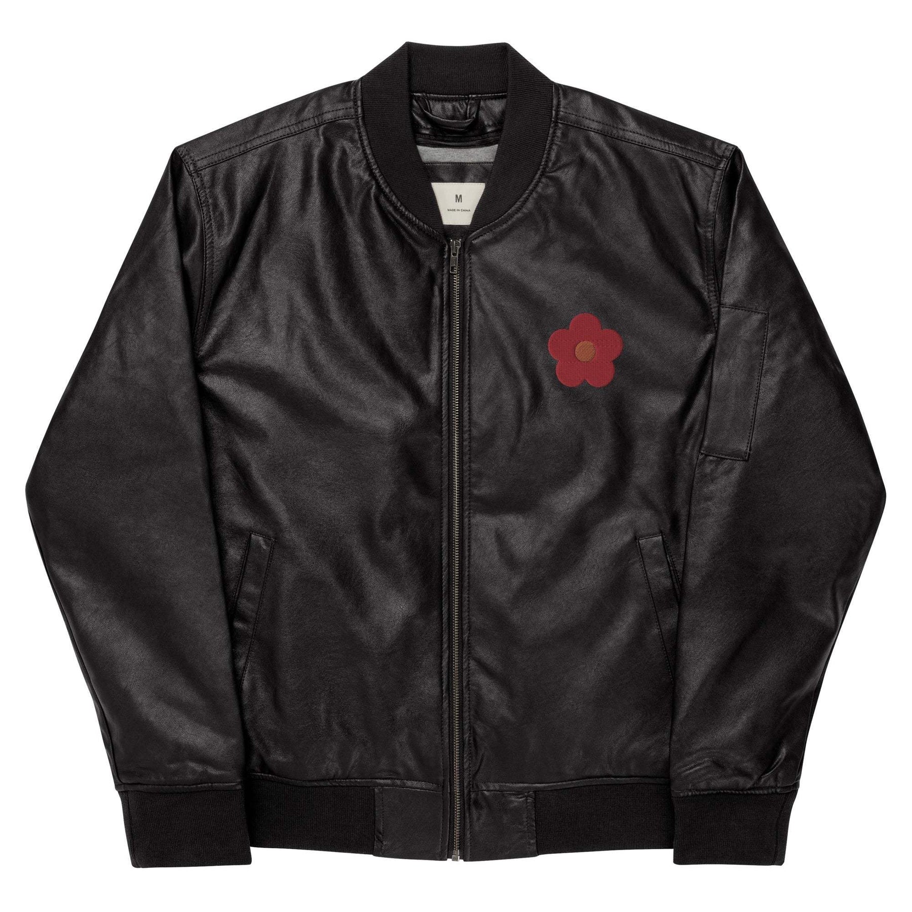 Black leather bomber jacket with rib-knit collar, cuffs, and hem, featuring side and sleeve utility pockets and a red flower embroidery on the chest