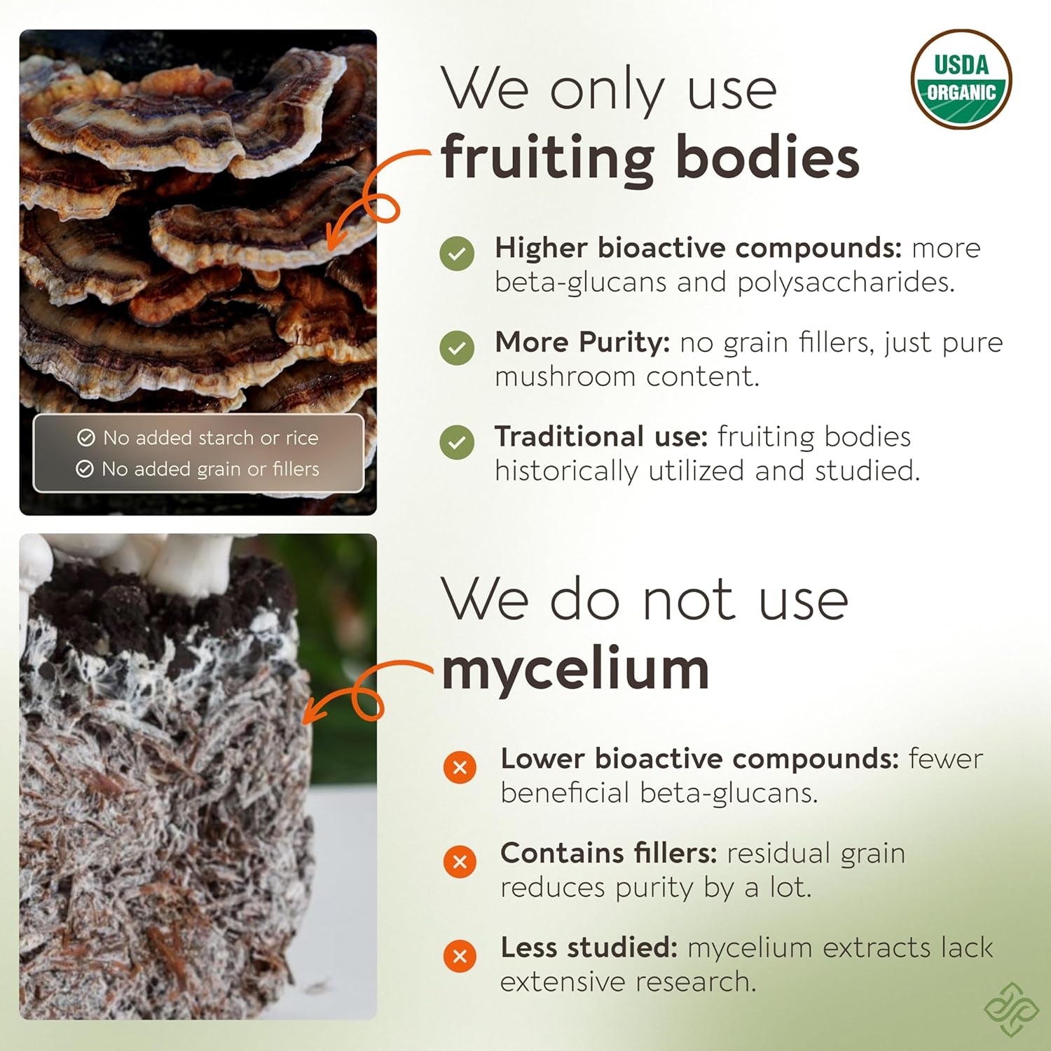 • 🌱 PURE & USDA ORGANIC CERTIFIED: Our USDA-certified Turkey Tail extract is derived exclusively from 100% fruiting body, free from grains, fillers, or additives. Experience pure, organic, and unadulterated mushrooms for superior health benefits